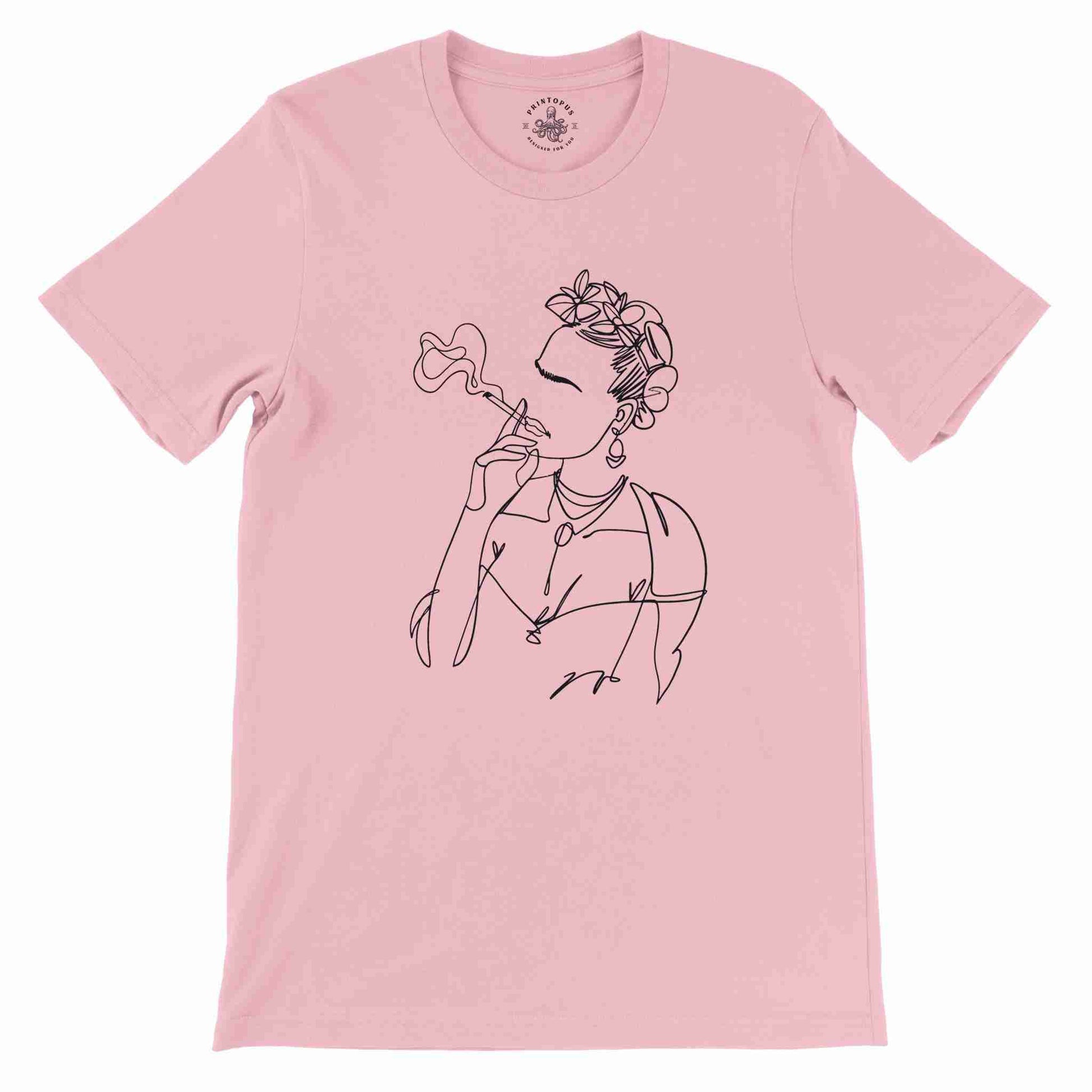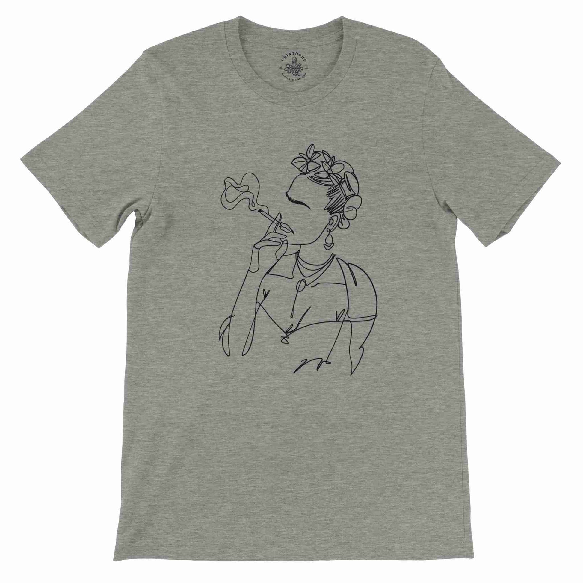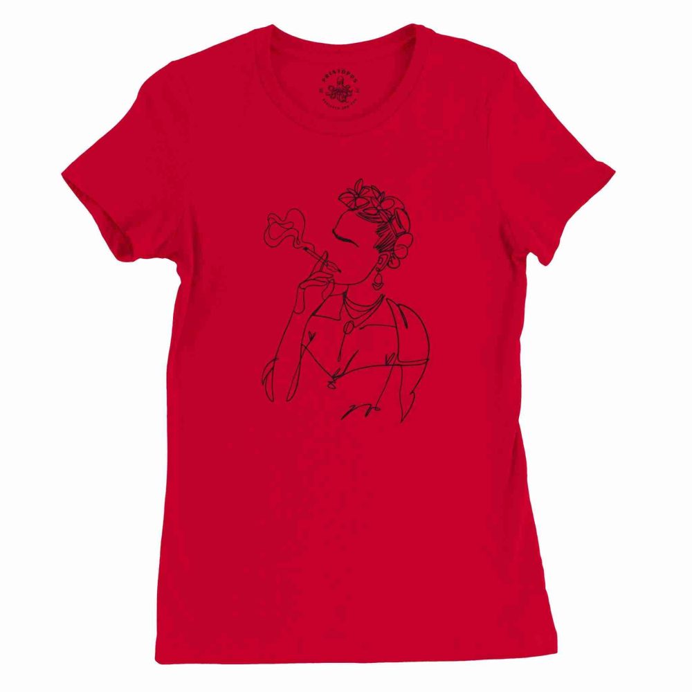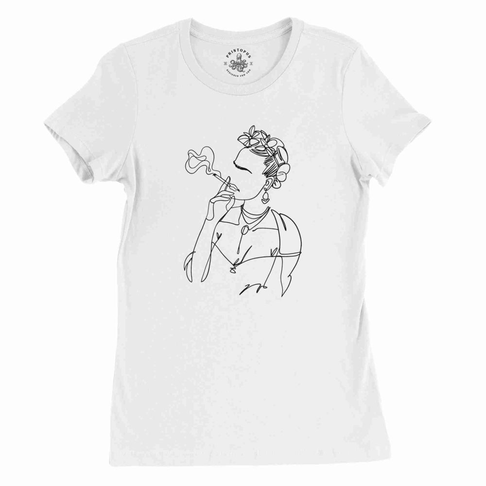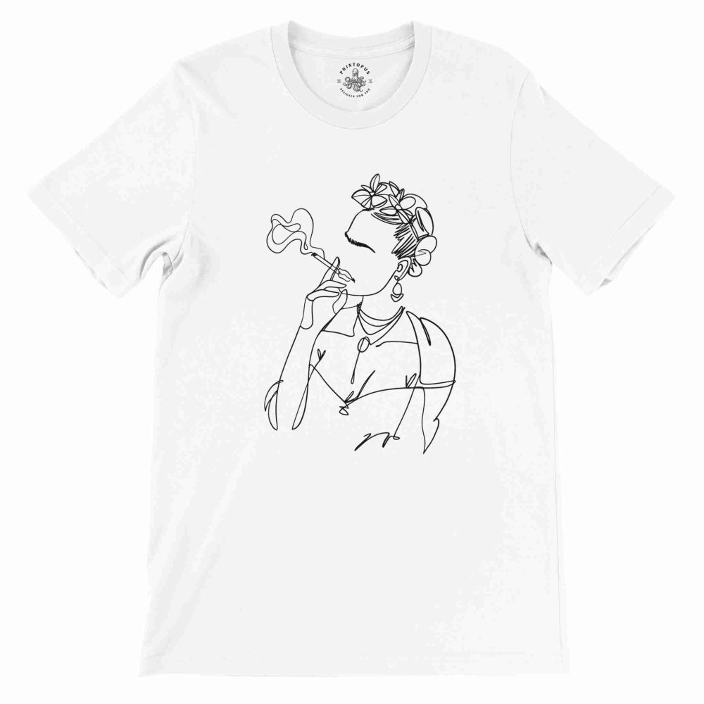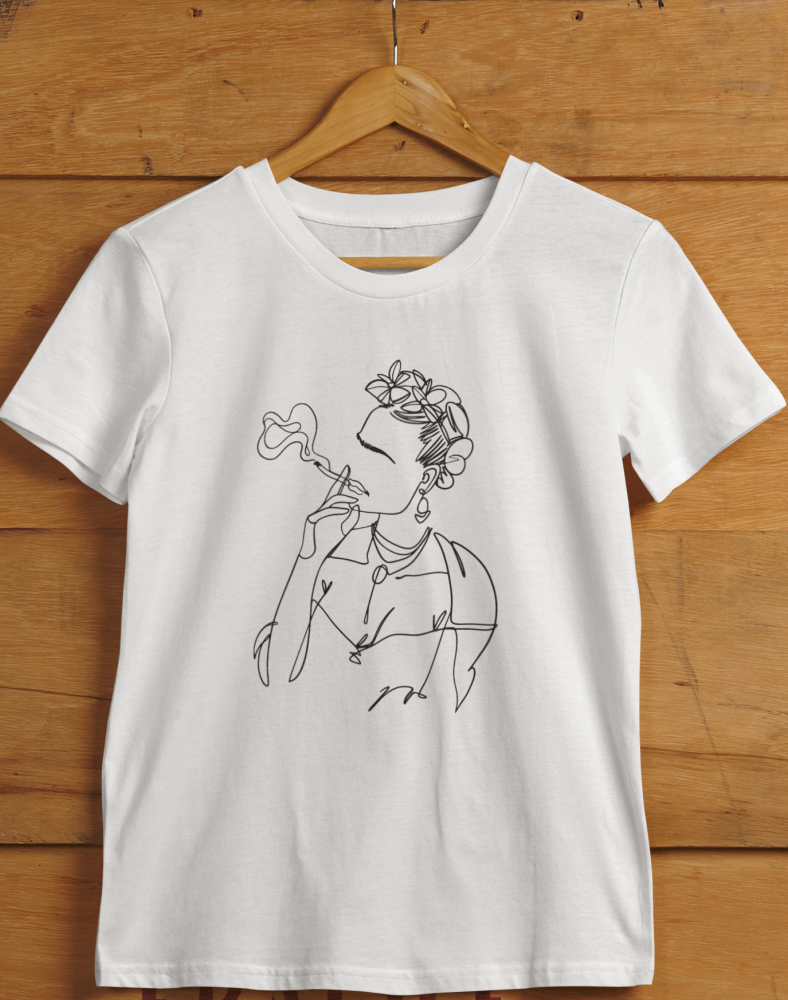 Celebra la pasión y el arte con nuestras "Líneas de Pasión". 🎨🚬 Este dibujo a líneas presenta a Frida Kahlo con un cigarrillo, capturando su esencia rebelde y artística en una representación minimalista. Una prenda que rinde homenaje a la fuerza y la creatividad de esta icónica artista. 💪👕